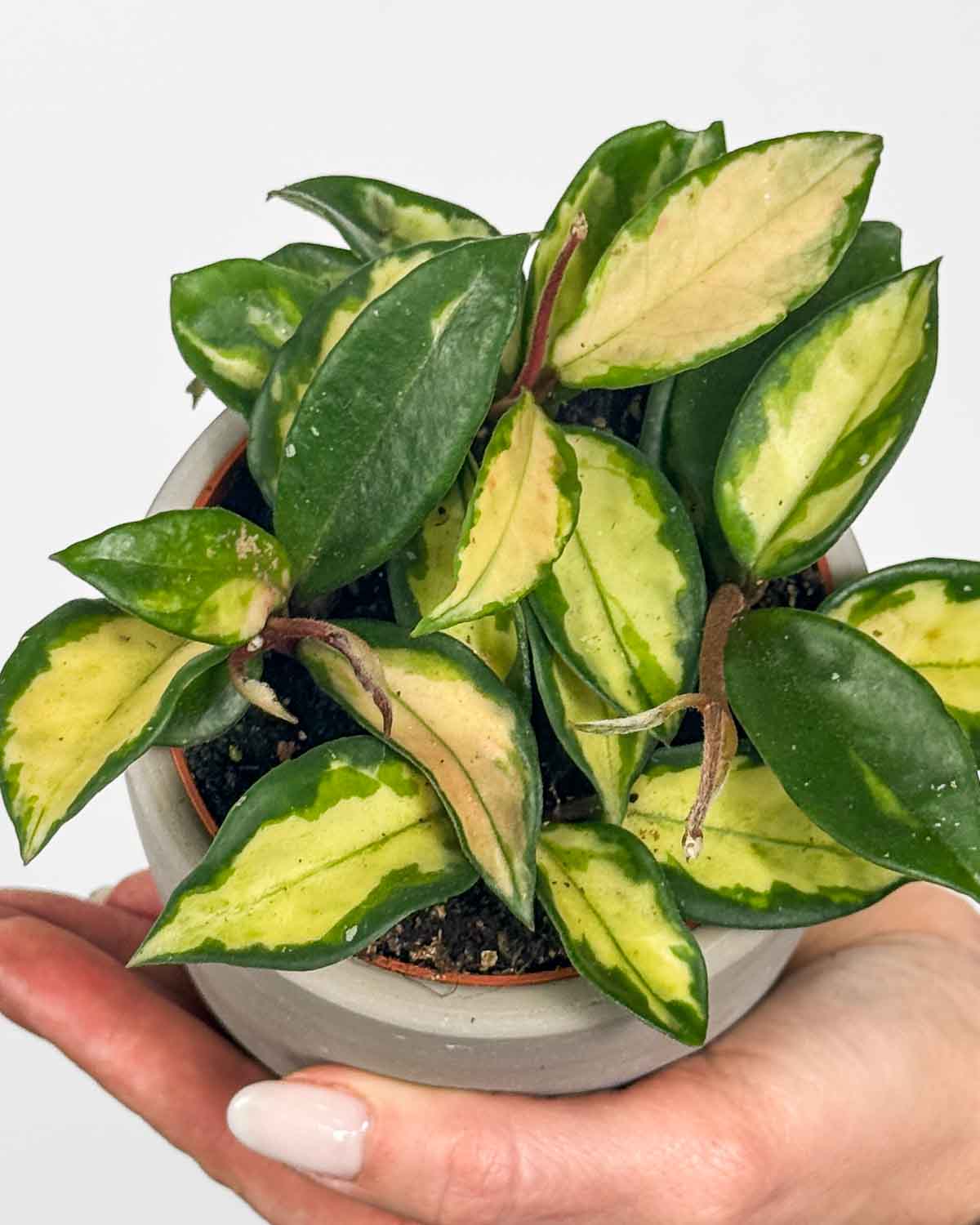Sem Voščenka ‘Tricolor‘ (Hoya carnosa), ena izmed barvito najbolj pestrih vrst hoj oz. voščenk. Moji listi so povoščeni, kompaktni in prelivajočih se zelenih, kremnih in rozastih odtenkov. Zaradi svoje oblike bom zelo hvaležna rastla v visečem loncu. Če pravilno skrbiš zame, te razveselim s čudovitimi drobnimi zvezdastimi cvetovi, ki očarajo tudi s prijetnim vonjem.