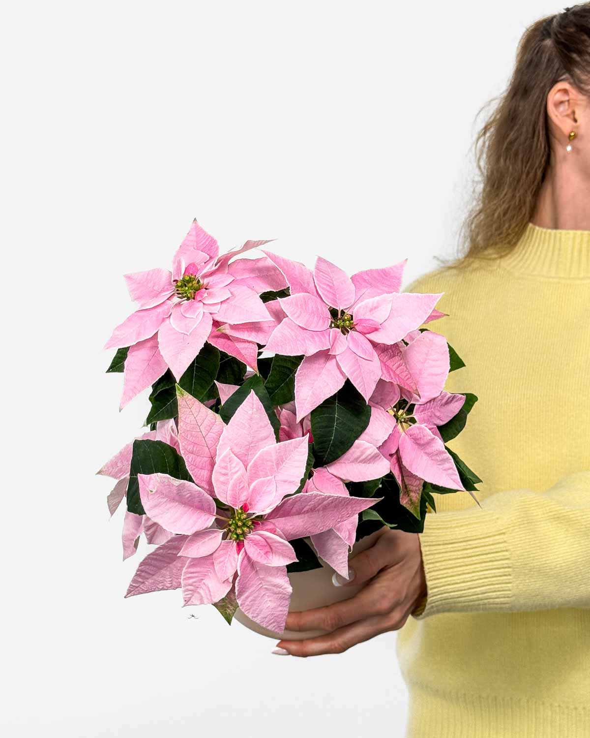 A si vedel_a, da ni nujno, da smo božične zvezde rdeče? No, jaz sem živi primer tega. Sem Božična zvezda ‘Pink’ (Euphorbia pulcherrima), božična zvezda z nežno rozastimi “cvetovi”, ki so v bistvu modificirani listi. No, kaj še čakaš? Ne bom dolgo na voljo. 😉
