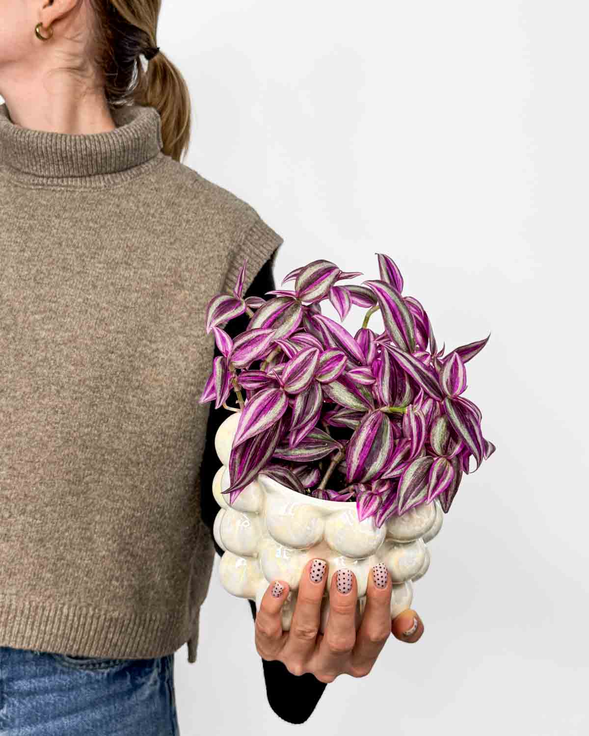 Iščeš rastlino, ki je enostavna za vzdrževanje, hitro raste in jo je enostavno razmnoževati? To sem jaz, Tradeskancija ‘Pink Paradise’ (Tradescantia zebrina)! Sem sorta, ki te bo navduševala s prekrasnimi listki, ki se prelivajo v zeleno, srebrno, živo pink in temno vijolično barvo. Če želiš, da ohranim bujno obliko, občasno obreži vrhove, ki jih lahko enostavno ukoreniniš v vodi ali zemlji.