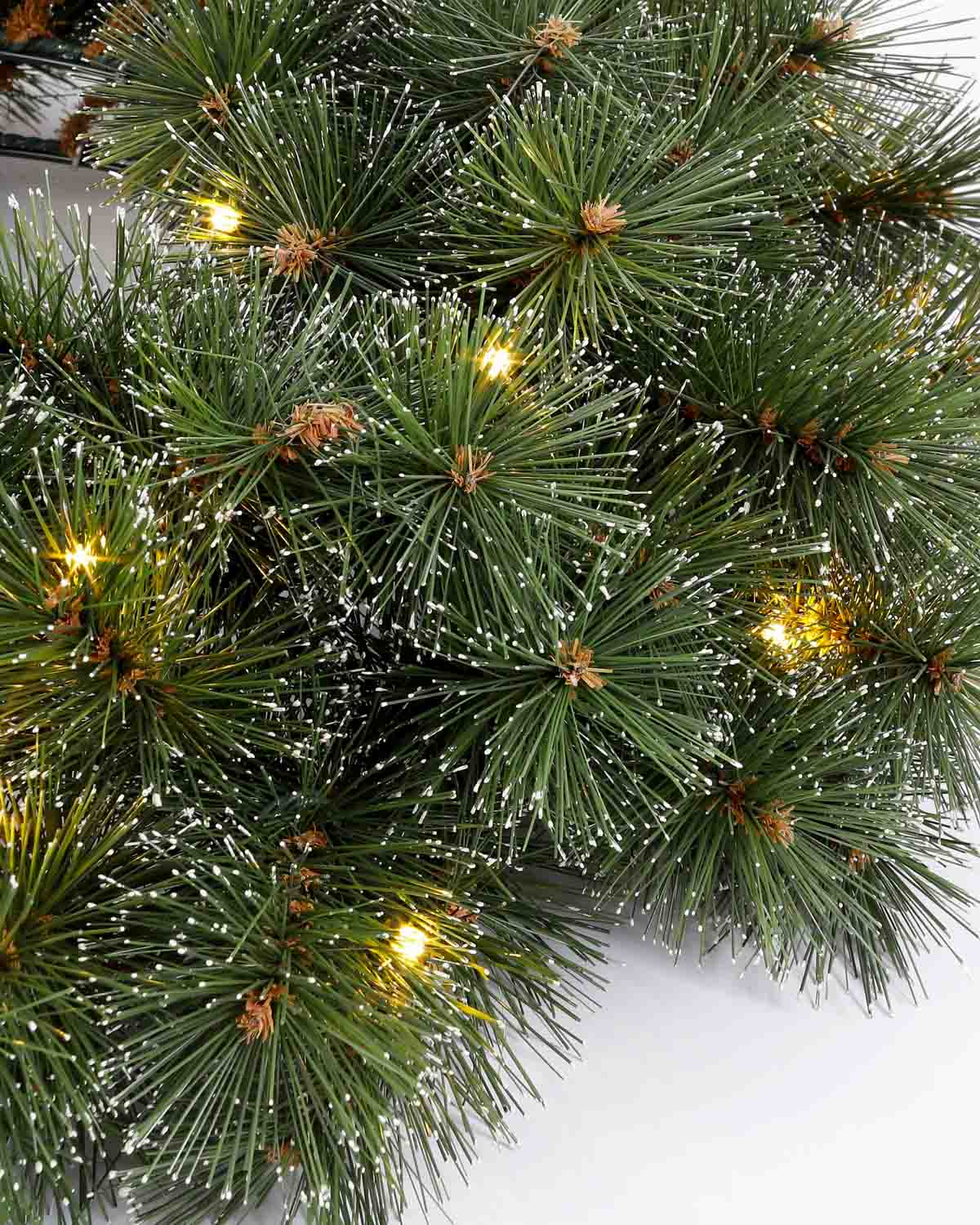 Venček je izdelan iz kakovostne mešanice mehkih in trdih PVC iglic (debelina 0,38 mm), ki poskrbijo za realističen videz gostega zelenja. Vgrajenih ima 72 vejic, ki ustvarjajo bogato strukturo, in LED lučke v toplo belem odtenku, ki pričarajo prijetno, nežno svetlobo. Napaja se z dvema AA baterijama (nista priloženi), zato ga lahko postaviš kamorkoli, brez potrebe po vtiču.